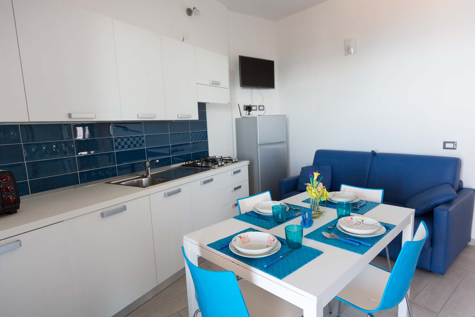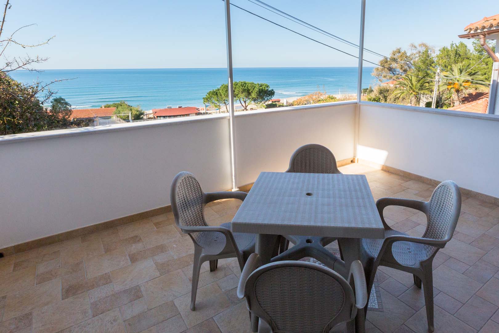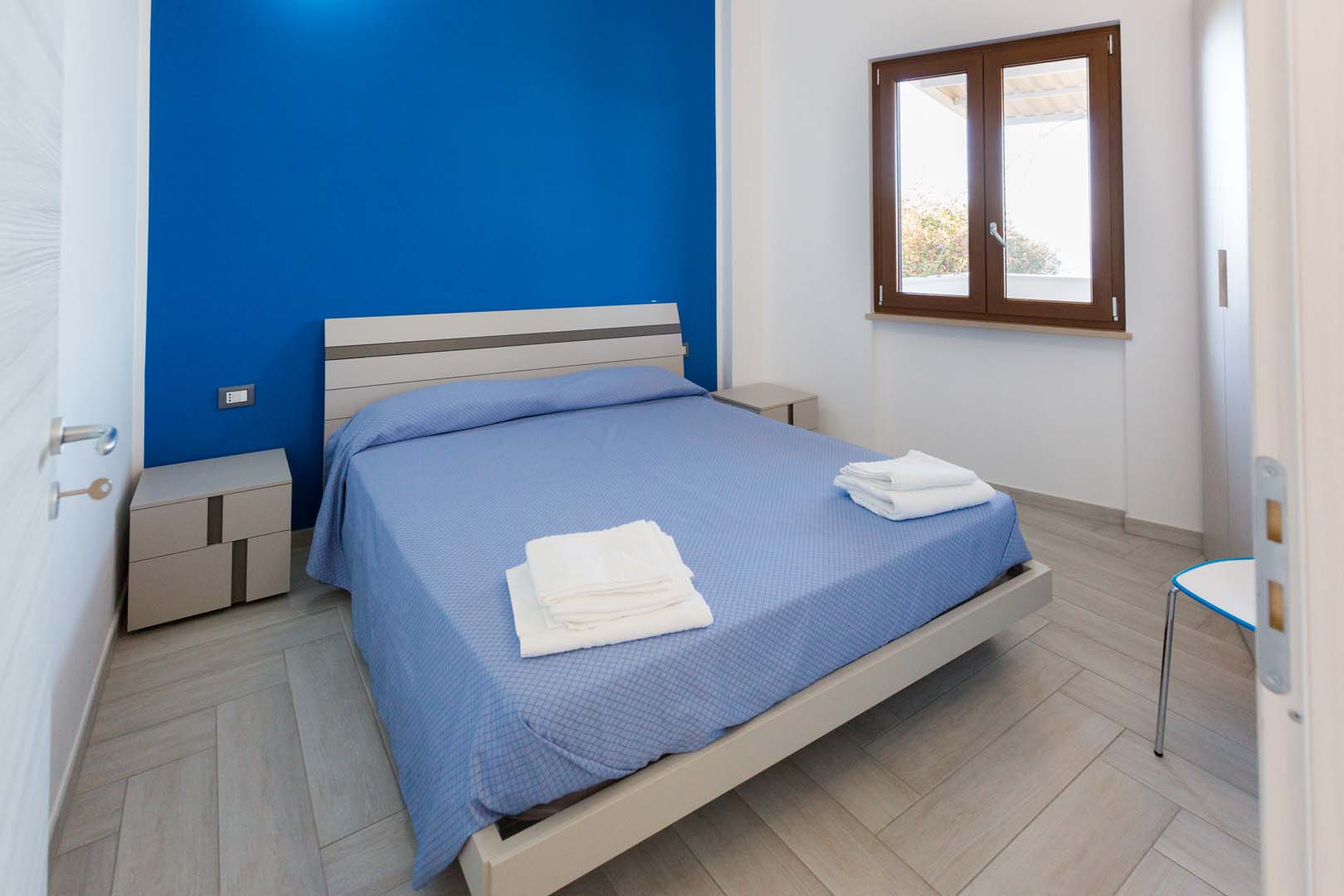 Situato al primo piano con ingresso indipendente, composto da una camera matrimoniale, cameretta con divano letto a castello, soggiorno con angolo cottura e divano letto, bagno. Terrazzo fronte mare attrezzato con tavolo e sedie. Occupazione massima 4 posti letto.
