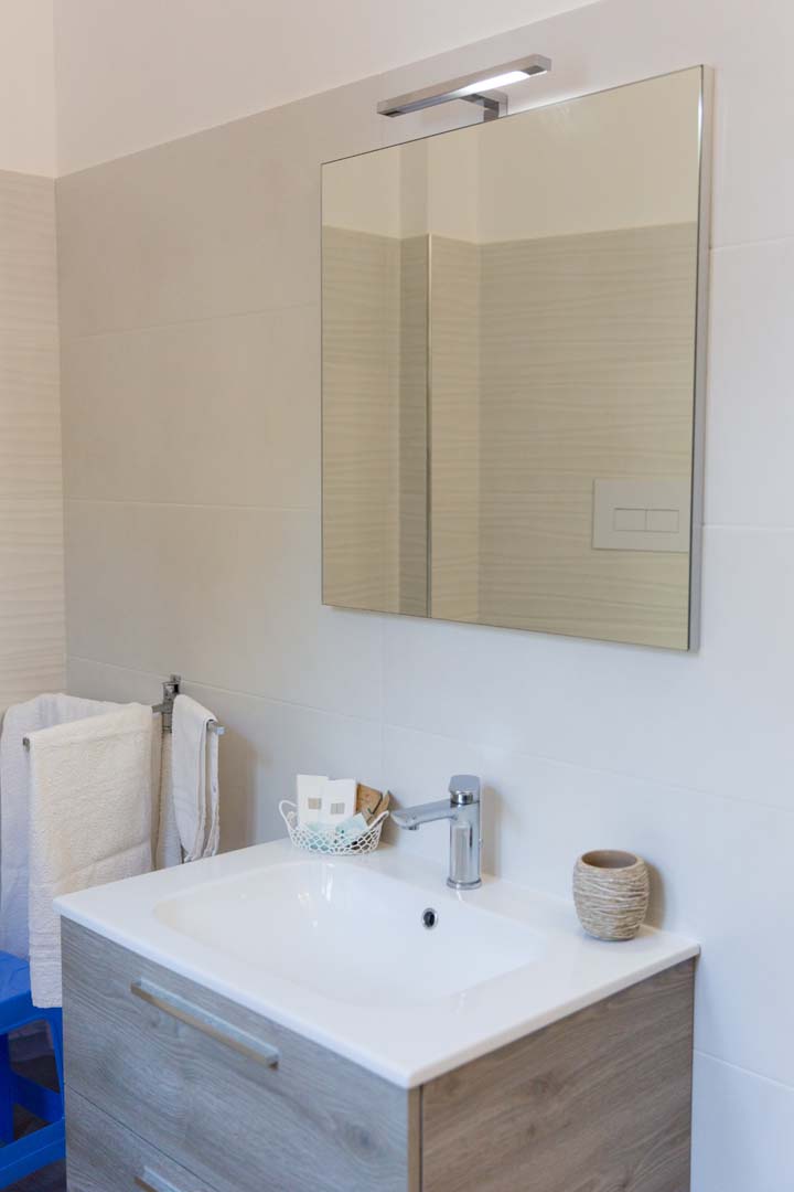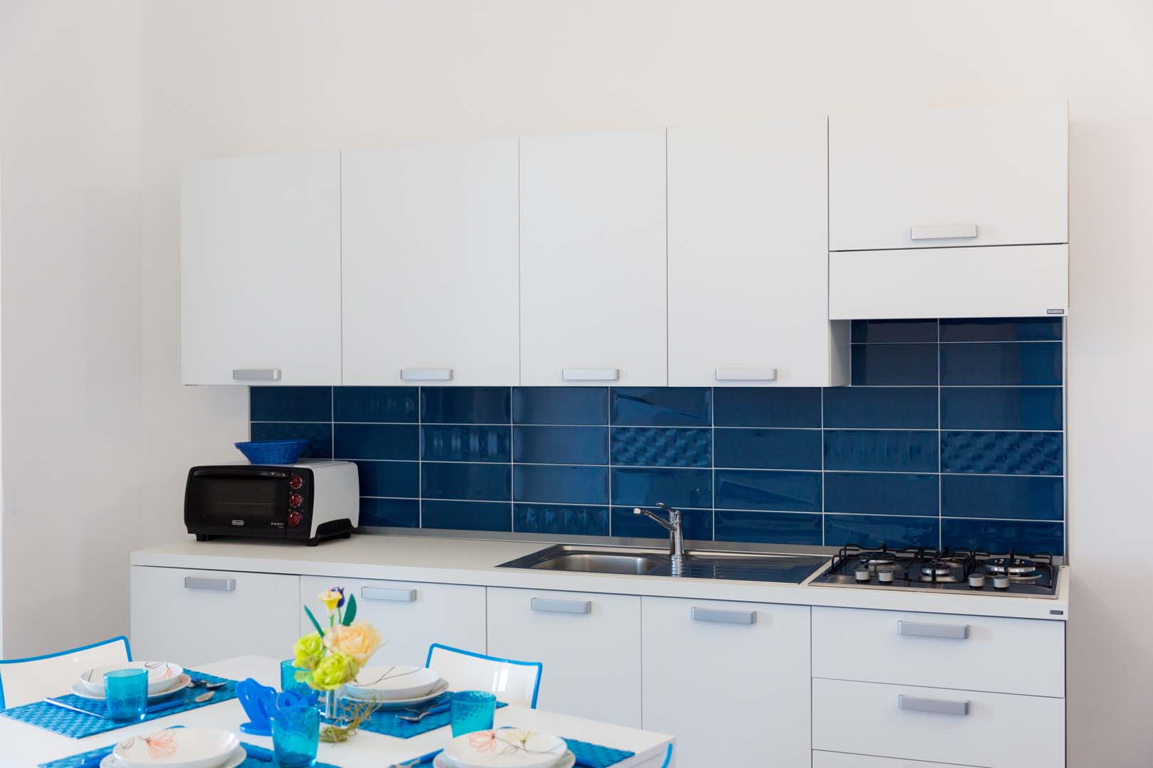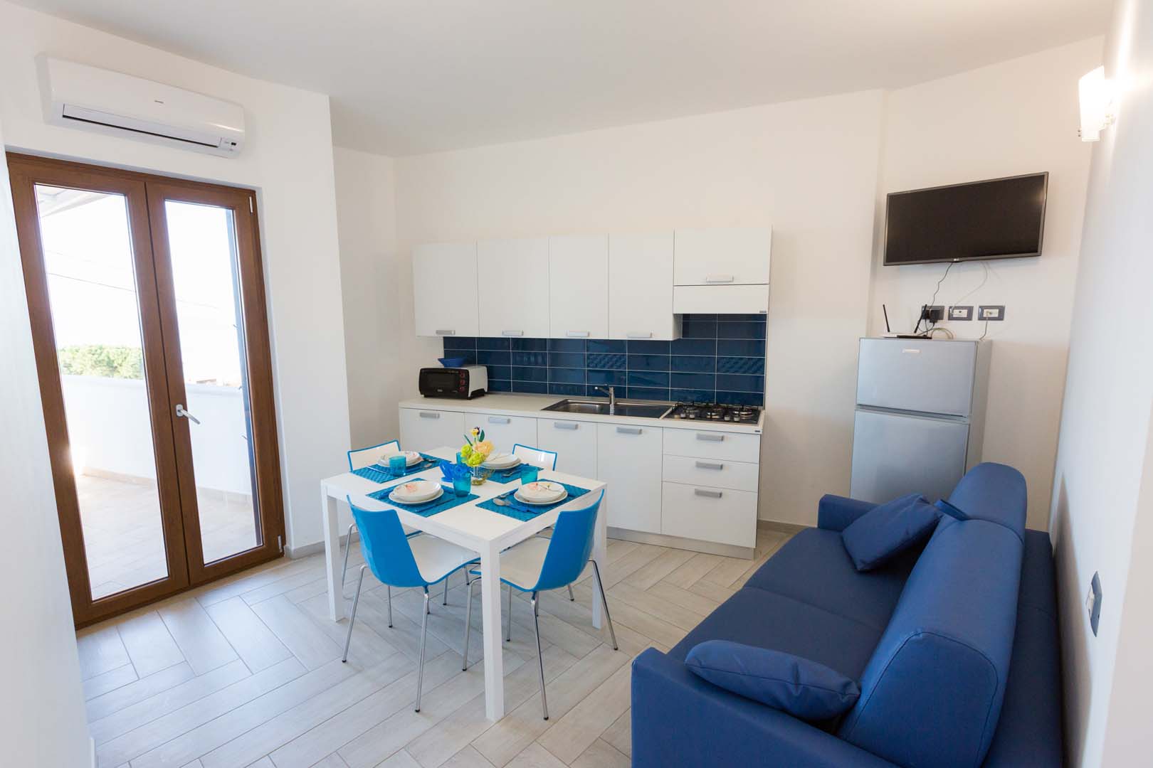 Situato al primo piano con ingresso indipendente, composto da una camera matrimoniale, cameretta con divano letto a castello, soggiorno con angolo cottura e divano letto, bagno. Terrazzo fronte mare attrezzato con tavolo e sedie. Occupazione massima 4 posti letto.