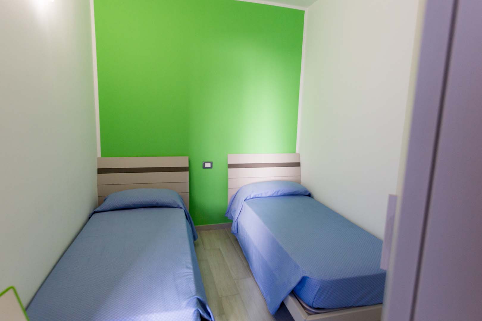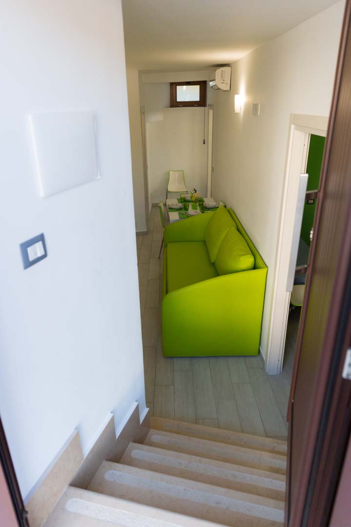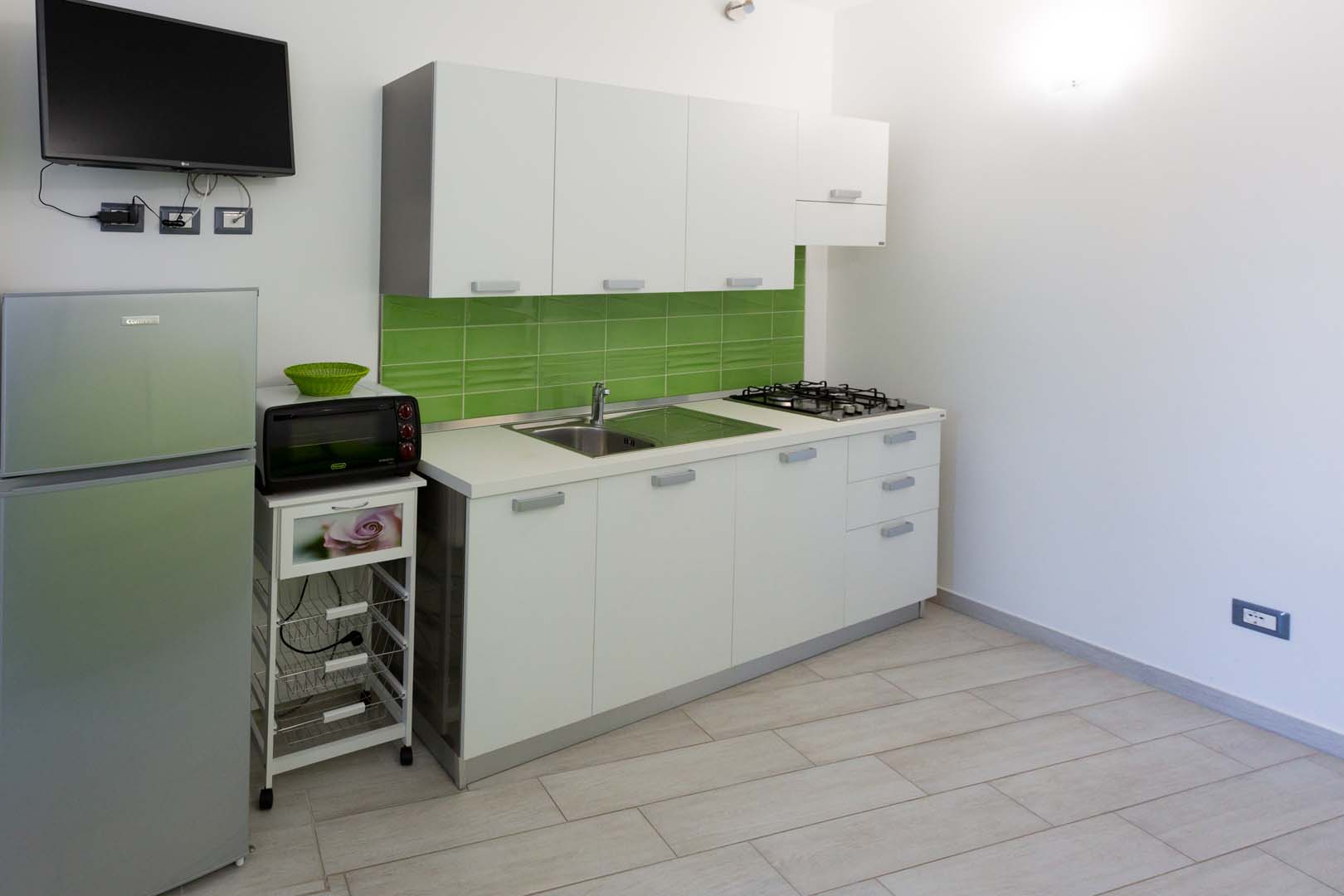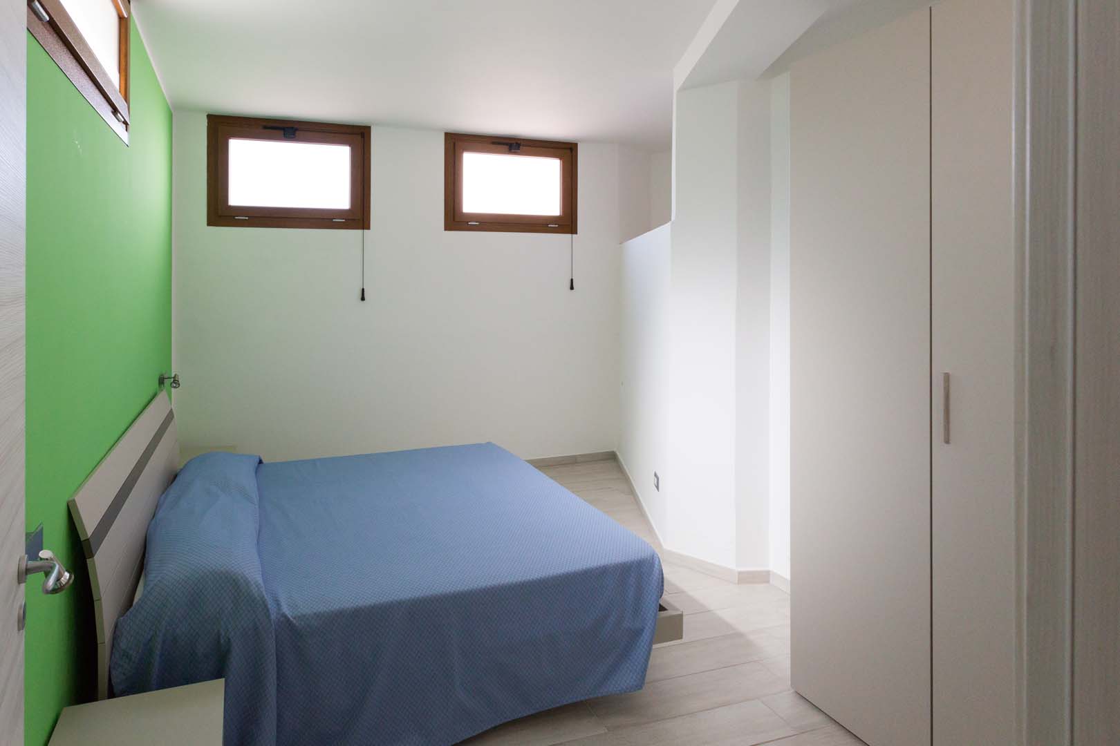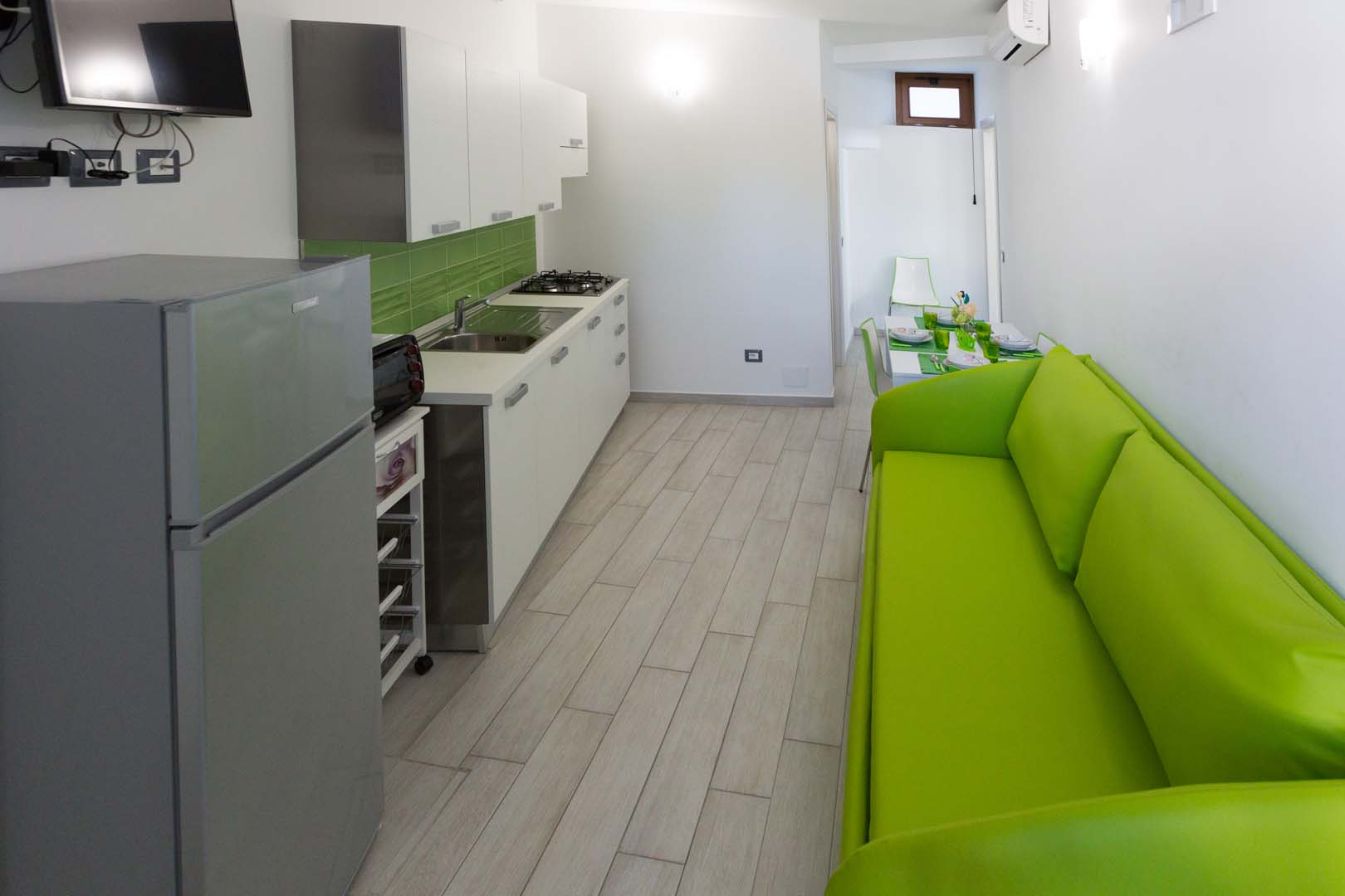 Situato a piano terra semiinterrato con accesso indipendente, composto da una camera matrimoniale, una camera con 2 letti, soggiorno con angolo cottura e divano letto, bagno + piccolo ripostiglio. Senza vista mare con finestre alte e senza spazi esterni. Occupazione massima 5 posti letto.