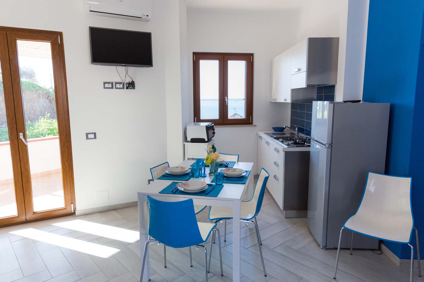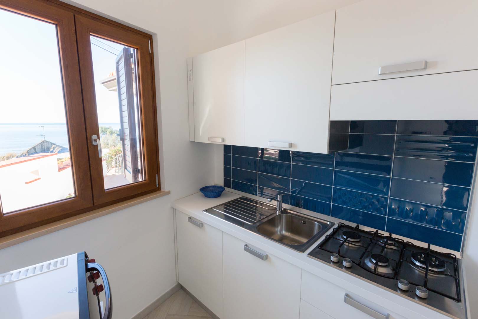 Situato al primo piano accessibile tramite una comodissima scale esterna, ingresso indipendente, composto da una camera da letto matrimoniale, soggiorno con angolo cottura e divano letto, bagno. Terrazzo vista mare con tavole e sedie più doccia esterna. Occupazione massima 3 posti letto.